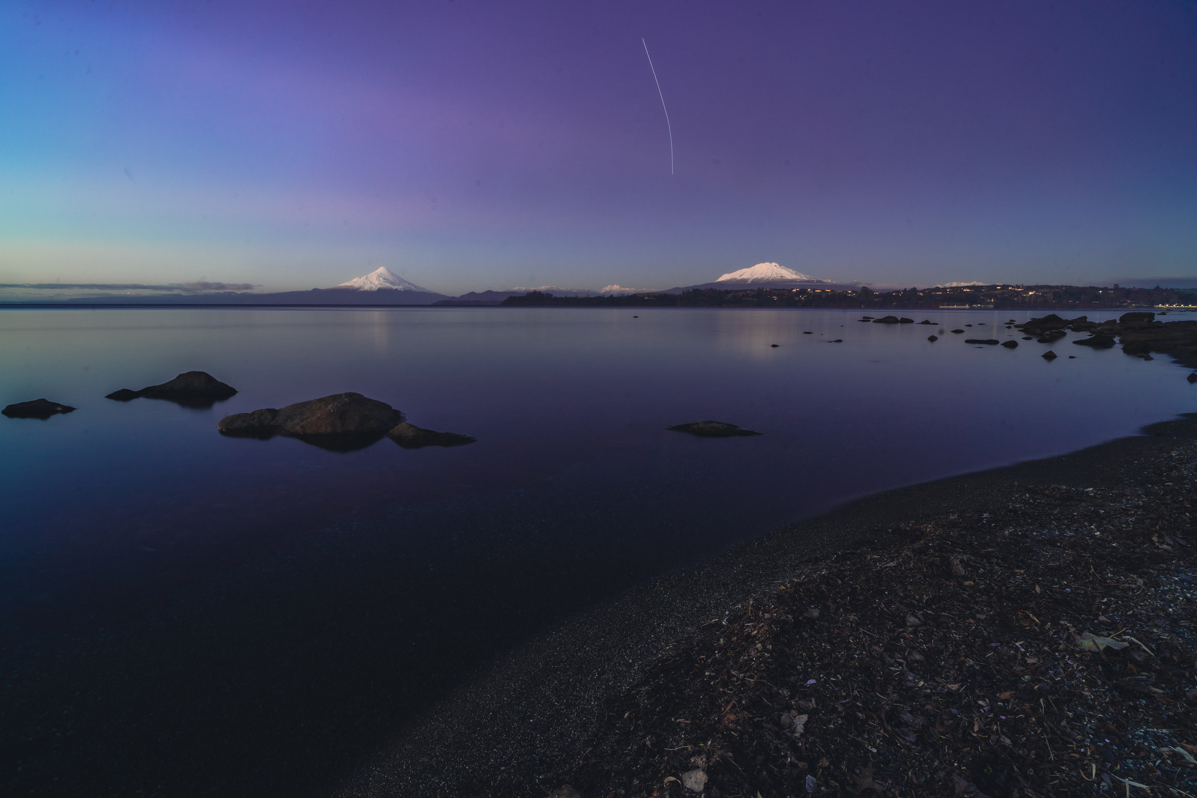 Long exposure at lake Llanquihue with the two volcanos Osorno and Calbuco at blue hour